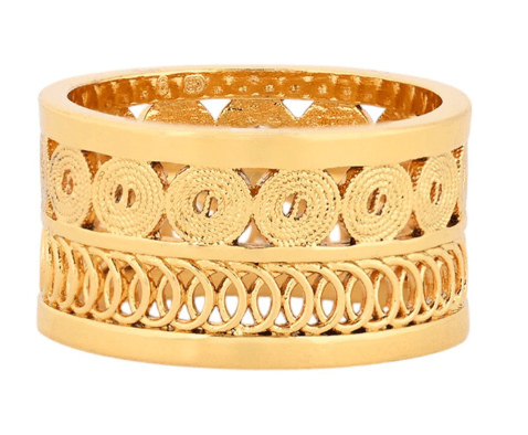 Ideal para quem valoriza a autenticidade da joalharia tradicional portuguesa. Perfeito para quem aprecia a arte da filigrana e os padrões clássicos da ourivesaria portuguesa, desejando expressar essa ligação através de acessórios elegantes e significativos. Um presente especial para celebrar a identidade portuguesa, ocasiões tradicionais ou para quem procura um anel versátil, banda e com história única.