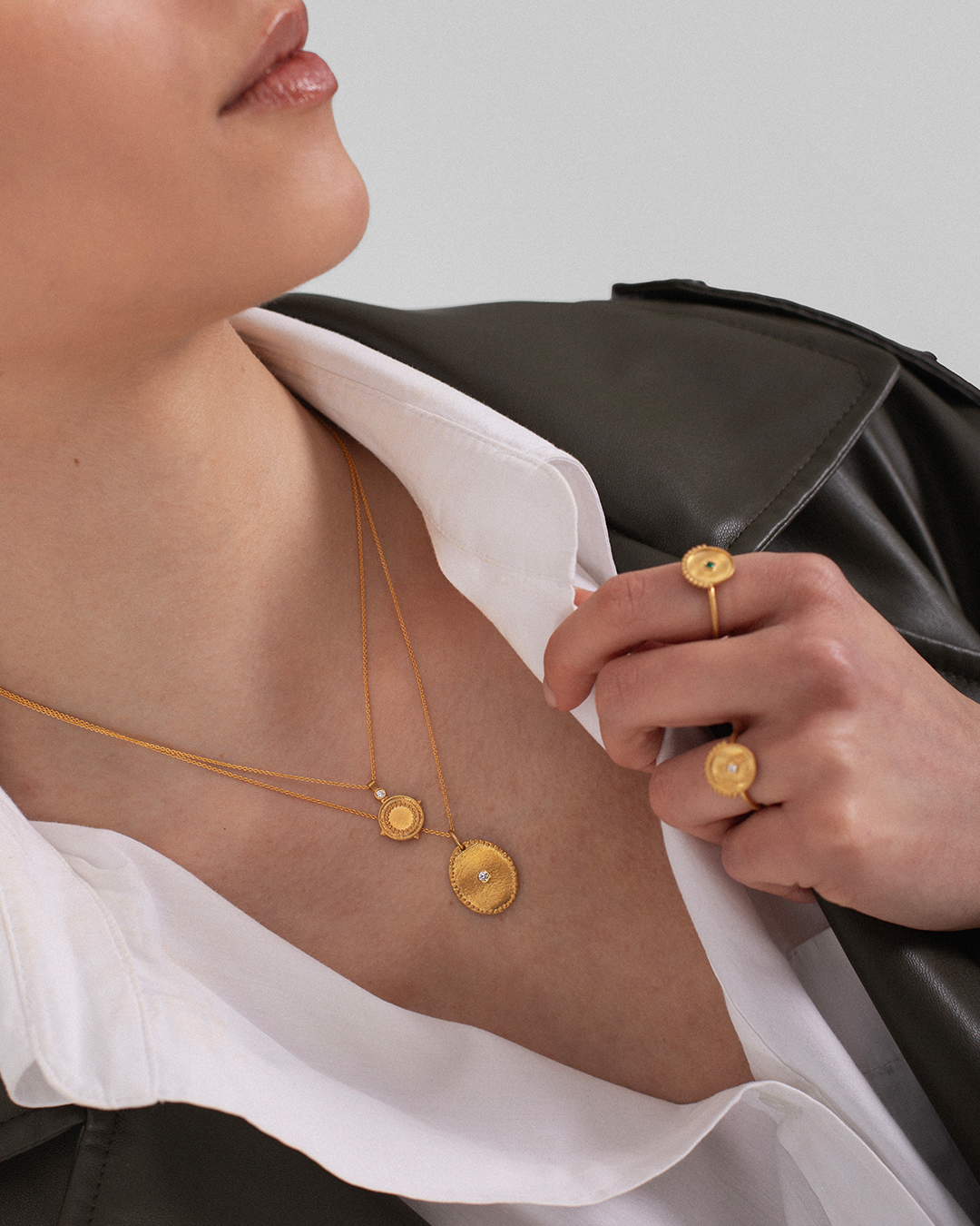 Anel ajustável em prata 925 e banho de ouro 18K com pendente redondo com relevo e zircónia cúbica colorida