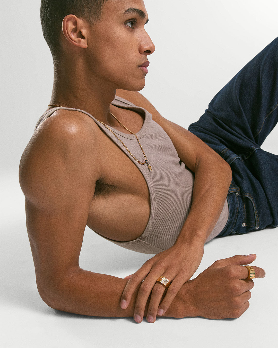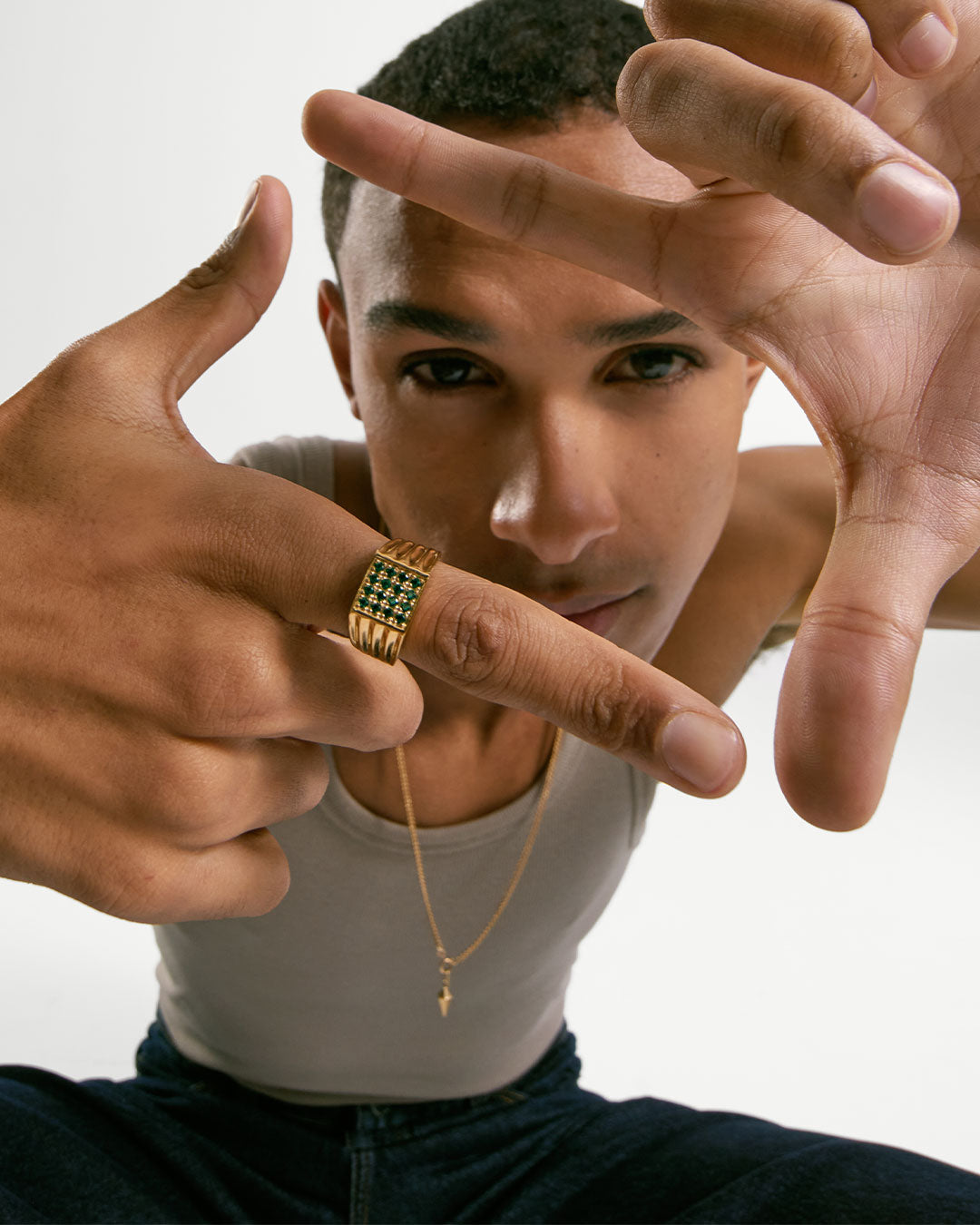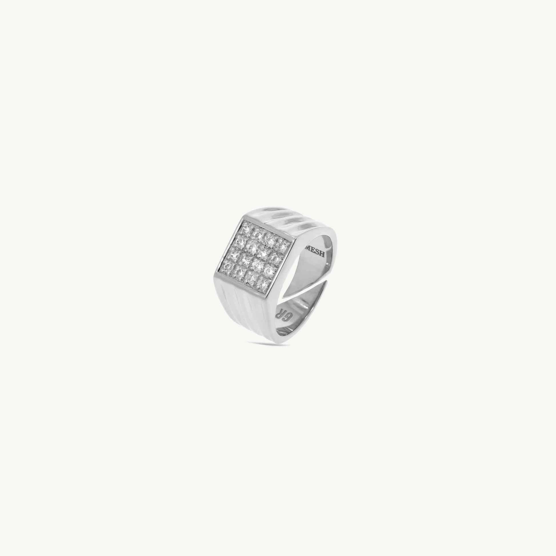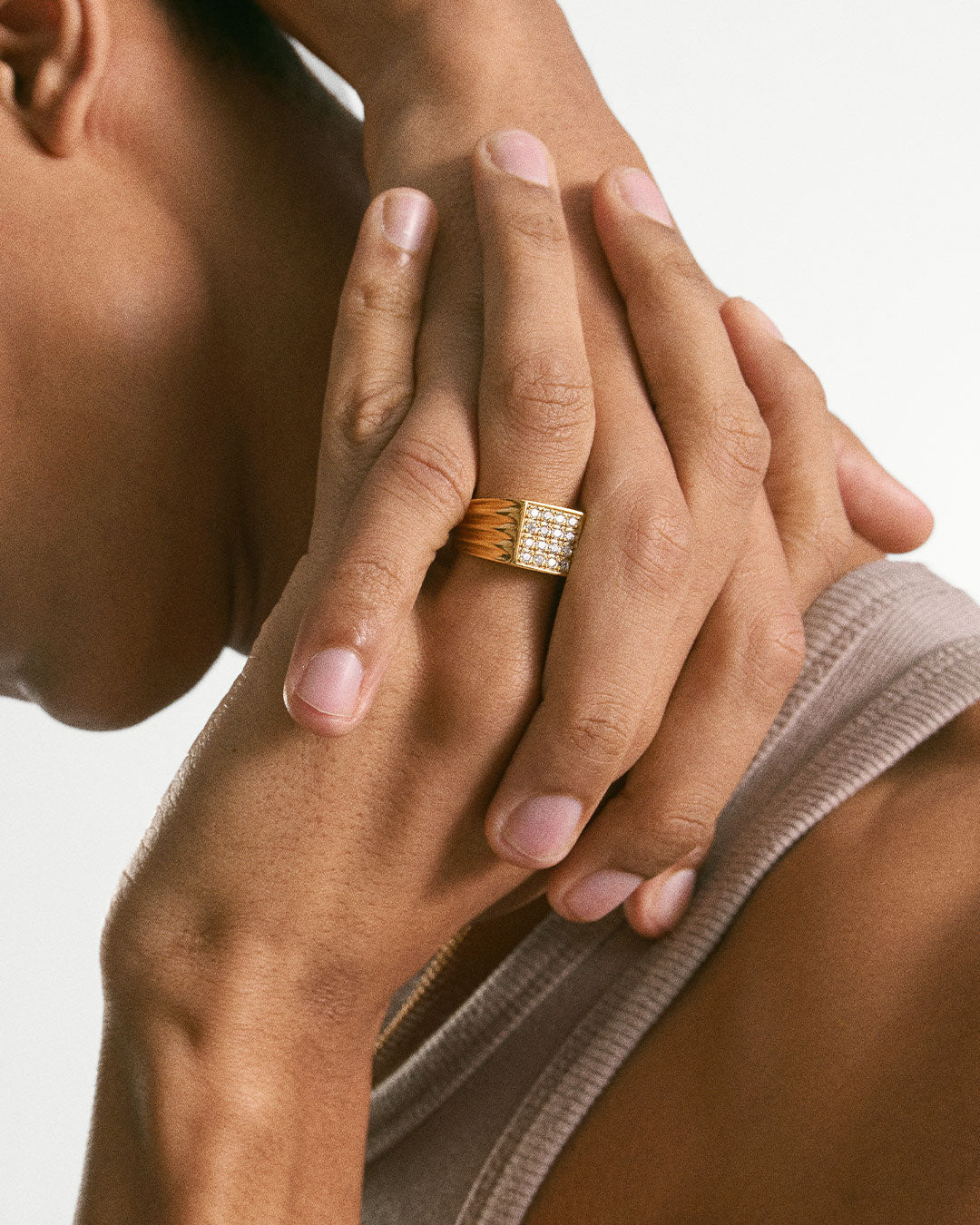 Anel ajustável em prata 925 com banho de ouro 18K ou ródio e zircónias cúbicas. Peça exclusiva em parceria com Gustavo Ribeiro.