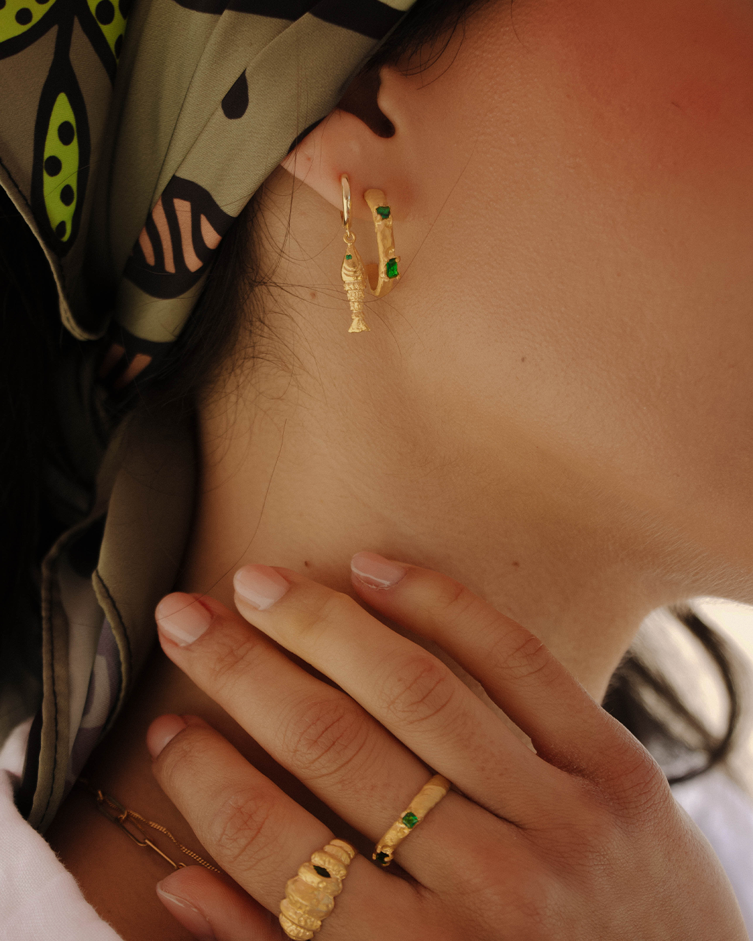 Argola singular com pendente peixe em prata 925 com banho de ouro 18k e zircónias.