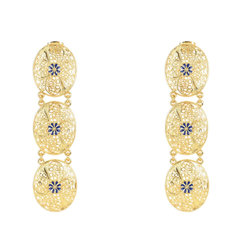 Descubra os nossos impressionantes Brincos Tradicional e Flor Longos em Aço Inoxidável Dourado, uma peça statement que celebra a fusão perfeita entre os padrões tradicionais portugueses e os motivos florais da nossa arte decorativa. Com design alongado e sofisticado que combina o melhor de duas tradições artísticas, estes brincos são perfeitos para quem valoriza joalharia impactante, com história e qualidade superior.