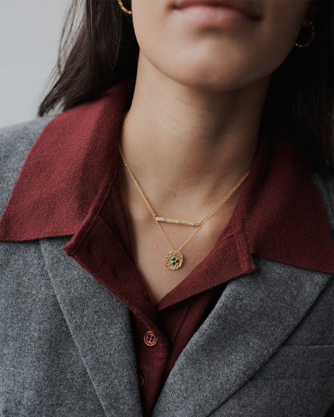 Colar em prata 925 e banho de ouro com pendente martelado e zircónias cúbicas.