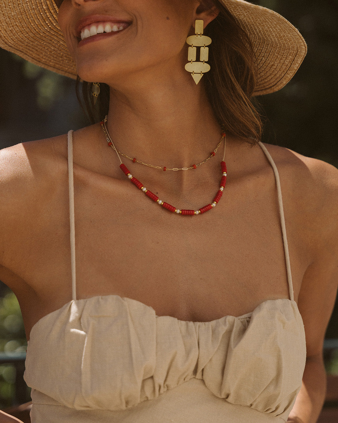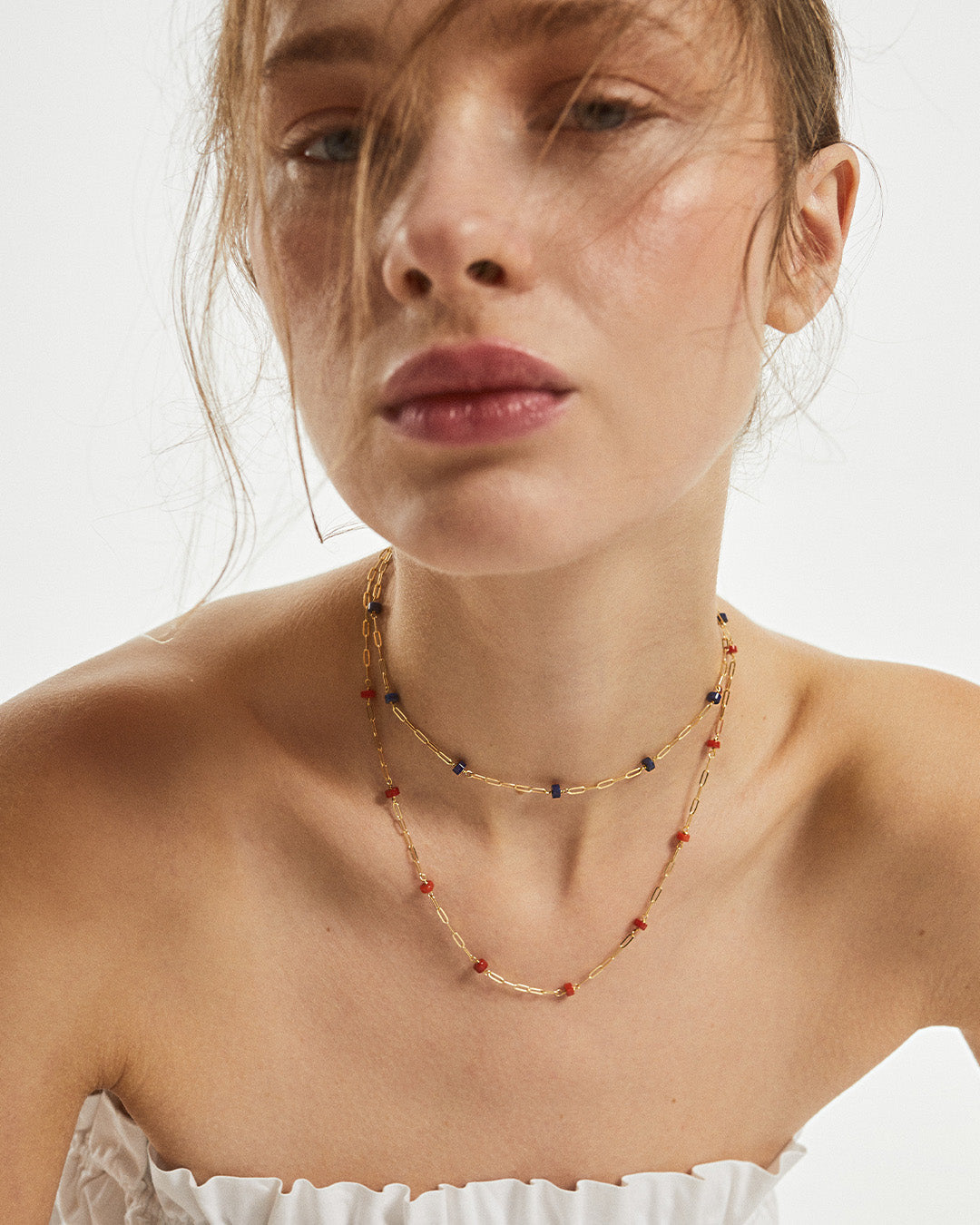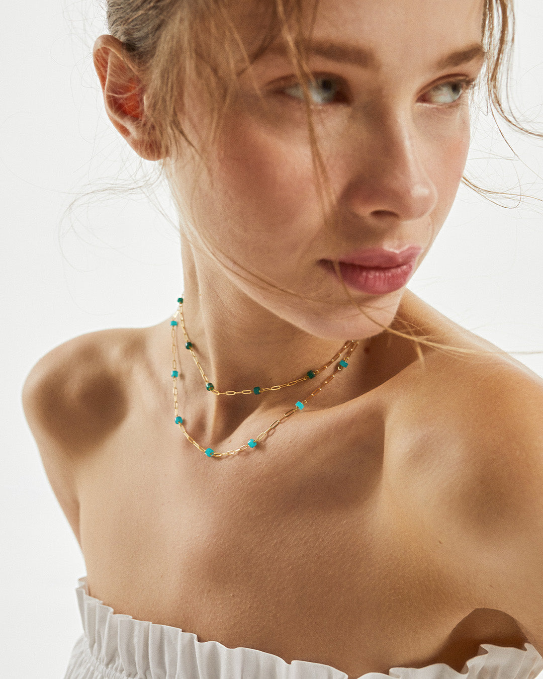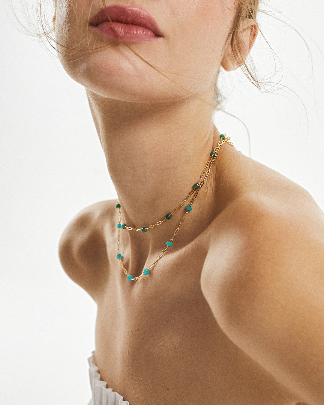 Colar com malha em prata com banho de ouro e pedras naturais.