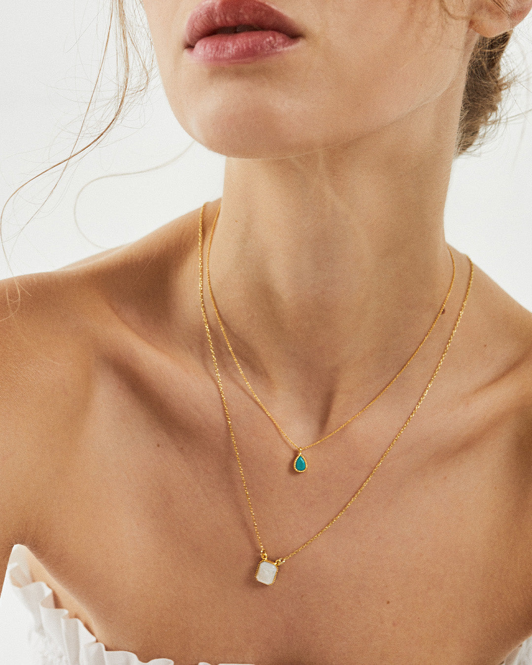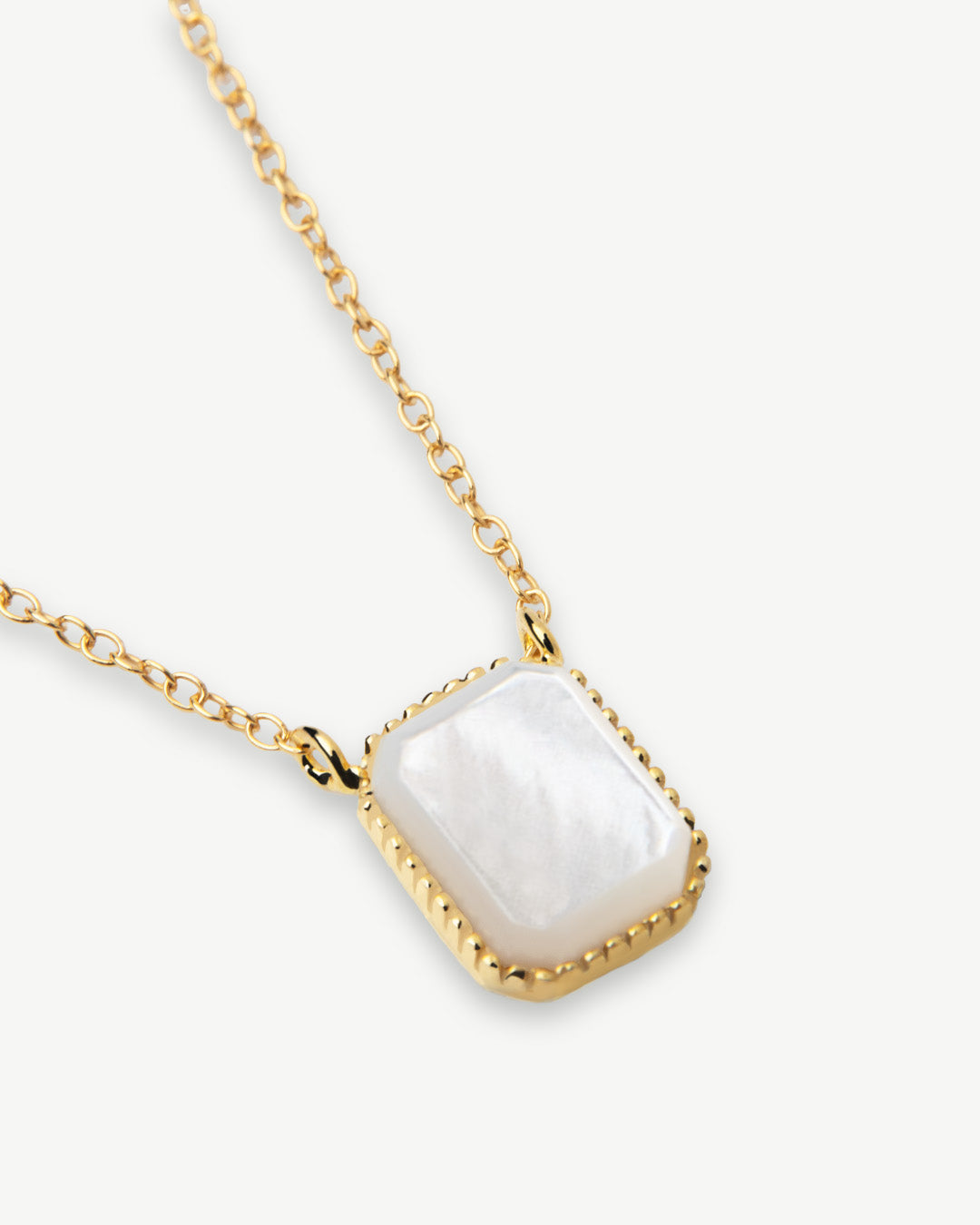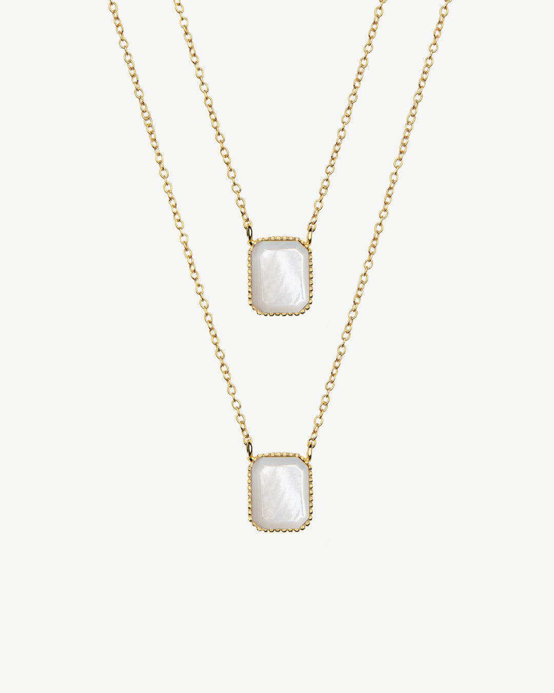 Escapulário em prata com banho de ouro e pendentes de madrepérola quadrados.