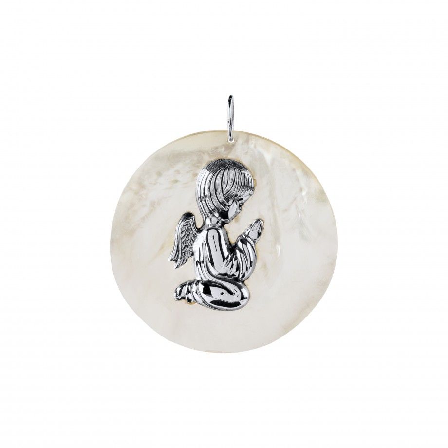 Berloque madreperola redondo com anjo Gabriel a rezar, em banho de prata, com 7,5cm de diâmetro. Sugestão: Ideal para ofertas de Comunhão e Baptizado.