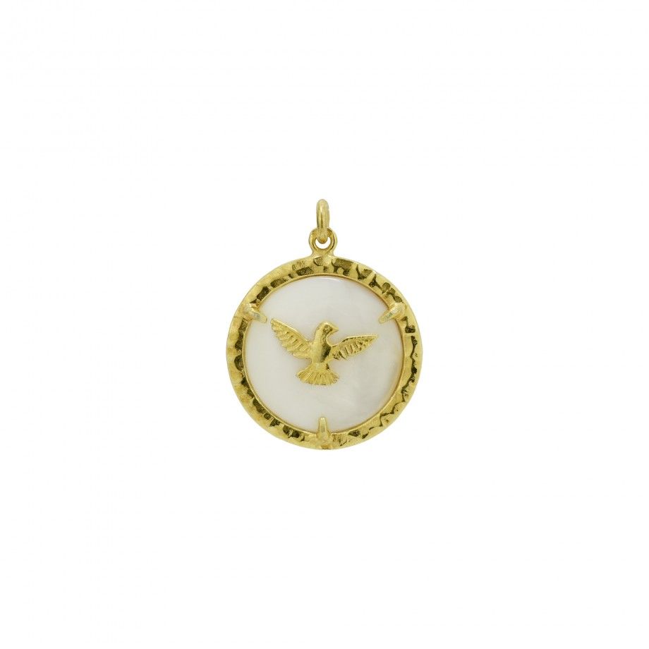 Medalha em prata banhada a ouro, com madreperola e Espirito Santo.