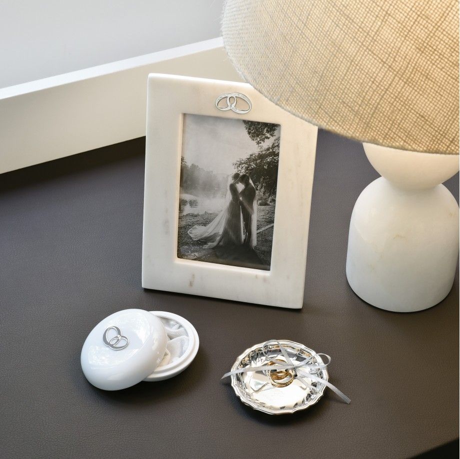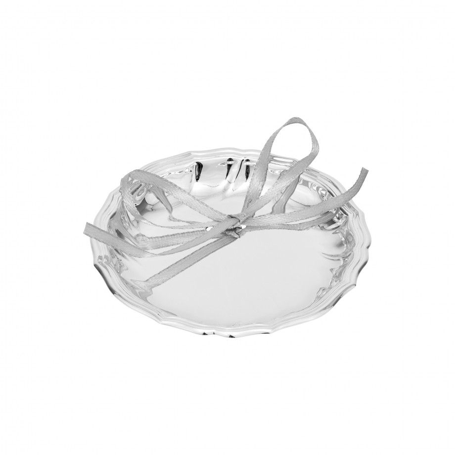 Porta alianças em banho de prata com fita em cetim para prender as alianças. Ideal para oferecer com uma gravação personalizada de nomes, data ou frase especial.