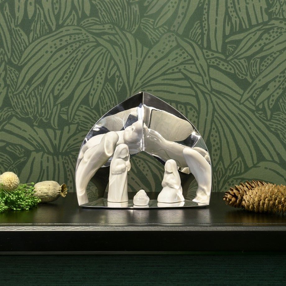 Presépio em banho de prata com três figuras em cerâmica.