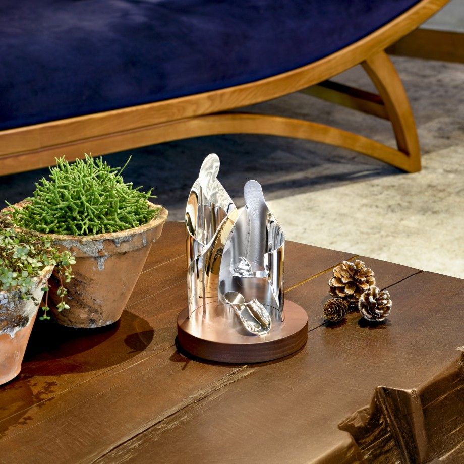 Nativity scene in metal with gold plating and wooden base. Palestine Collection.